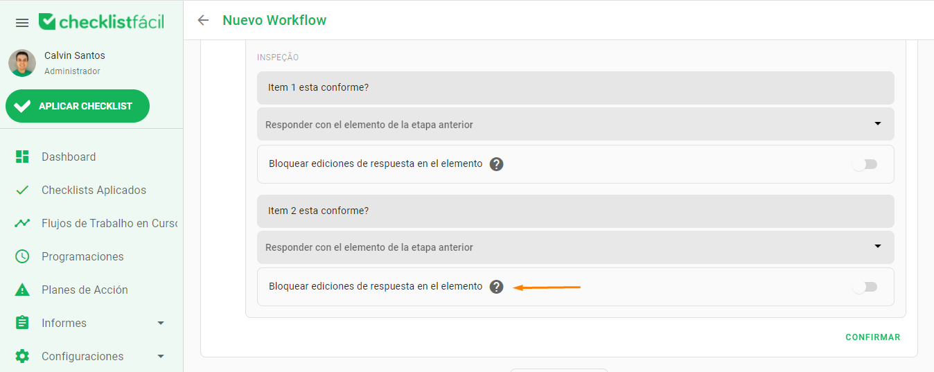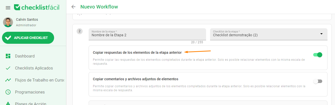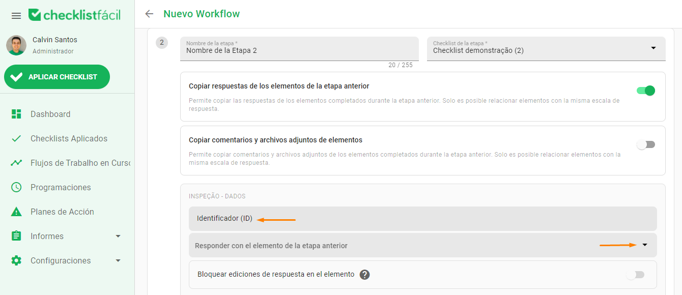 Al activar la función, aparecerá una lista con los elementos del checklist actual. Debajo de cada uno, encontrará un campo de selección con los ítems de la etapa anterior que poseen el mismo tipo de respuesta.