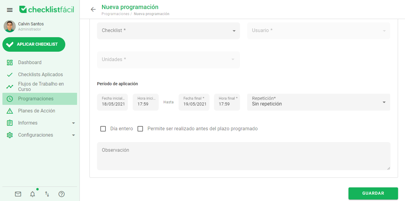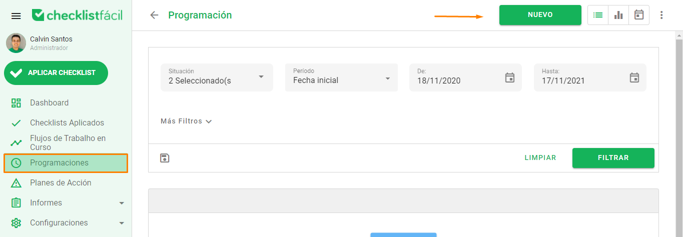 En la página de inicio de su base, acceda al menú de Programaciones y luego haga clic en el botón Nuevo: