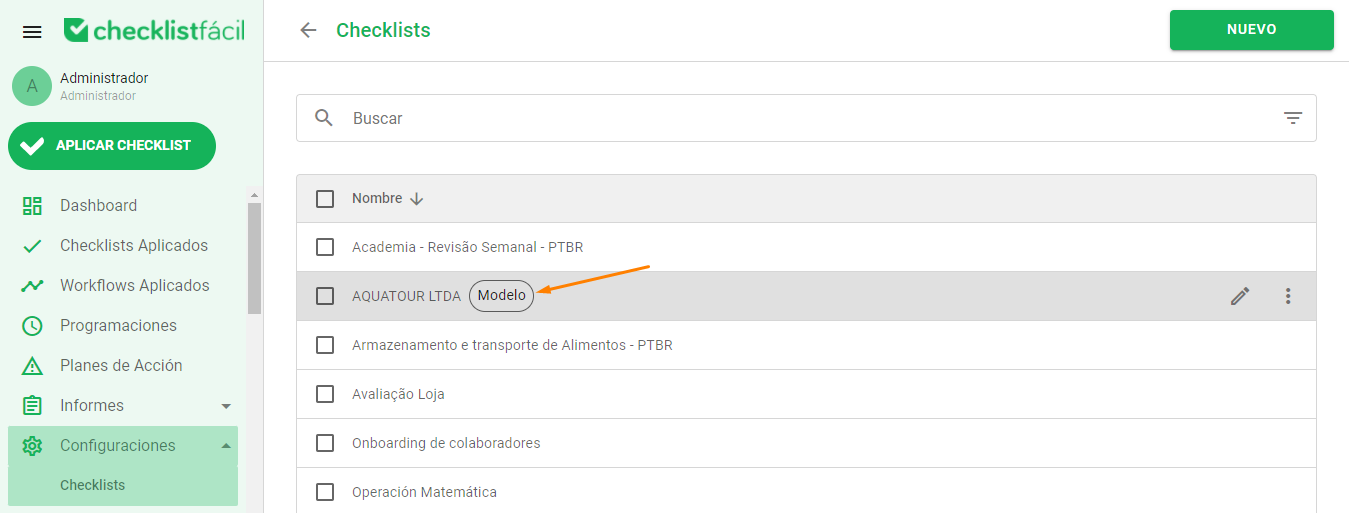 Los cuestionarios aparecen en orden alfabético. Puede usar la barra de búsqueda para localizar el deseado. Tras la activación, el sistema añadirá automáticamente la etiqueta "Modelo" junto al nombre del checklist en el listado general.