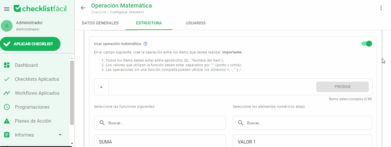 Para que la opción de Operación Matemática sea visible, el Checklist debe cumplir con las siguientes condiciones: