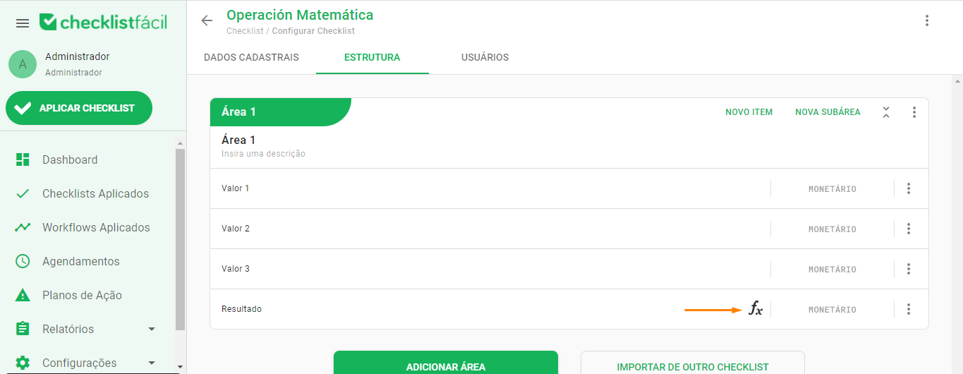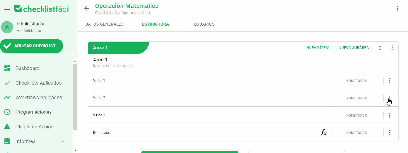 Para configurar el cálculo, siga esta ruta: Configuraciones > Checklist > Editar > Estructura > Modificar Ítem.
