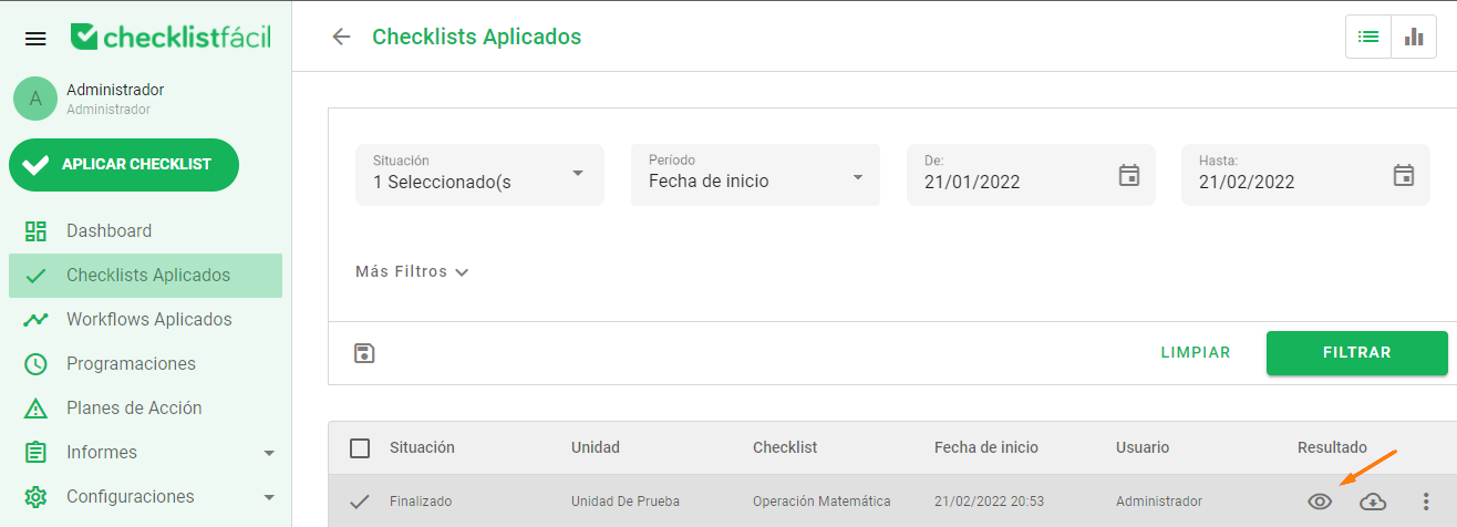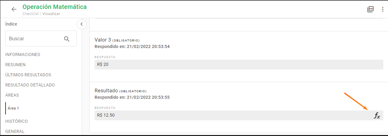 Para visualizar las operaciones matemática en sus informes, solo debe busque la evaluación que se aplicó con la configuración de la operación matemática en checklists aplicados y haga clic en el "Ver evaluación" indicado en la evaluación: