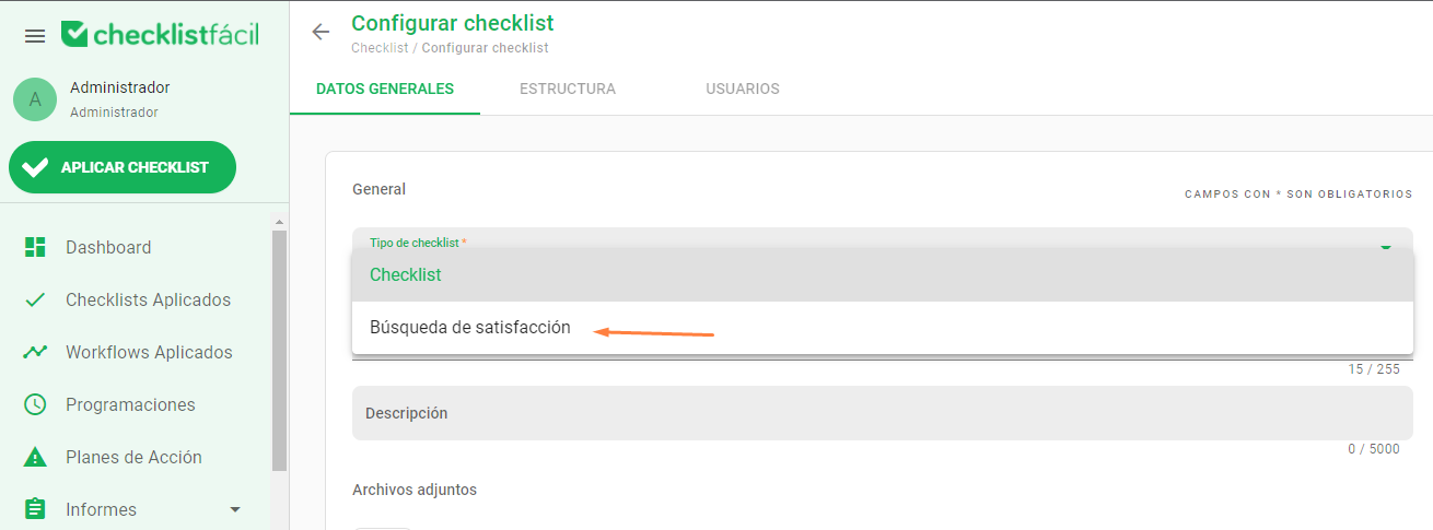 3. En la pestaña de DATOS GENERALES, localice el campo Tipo de Checklist y cambie la opción a Encuesta de satisfacción.
