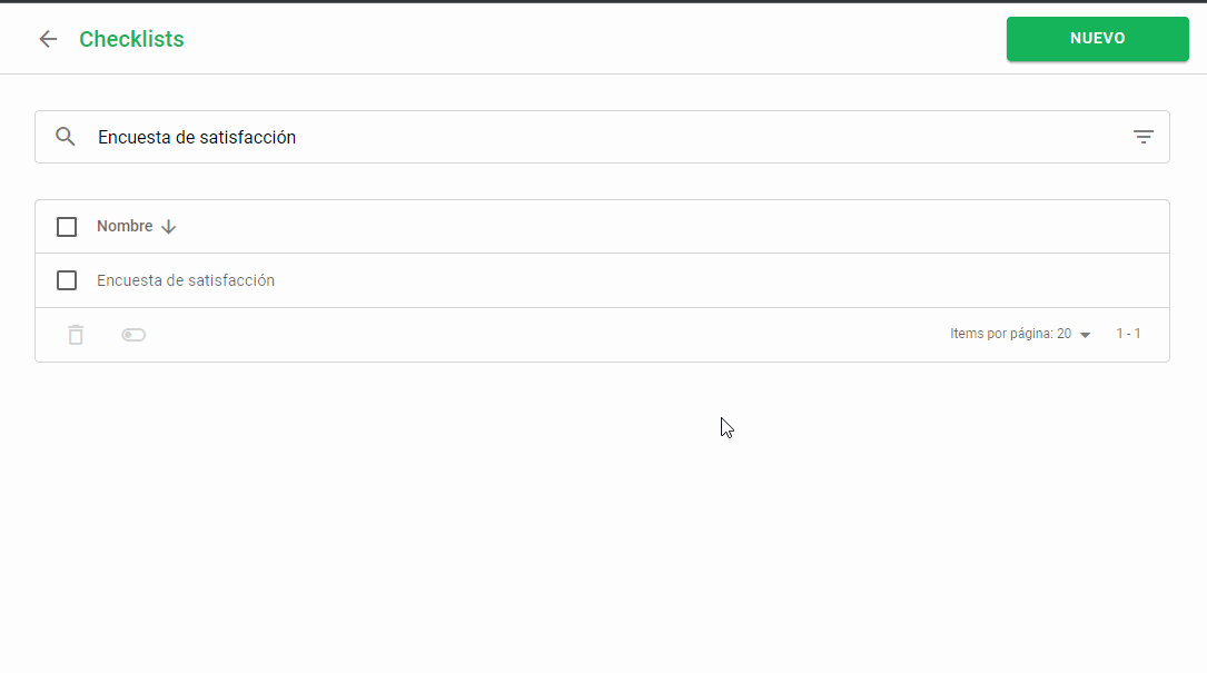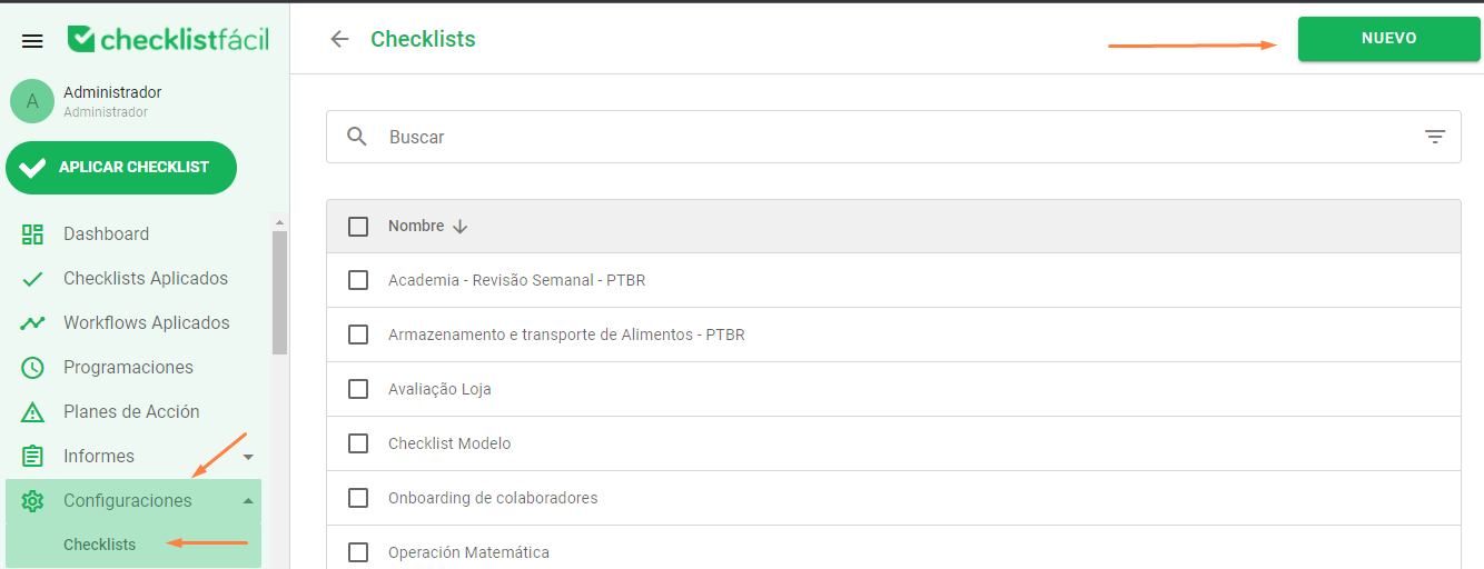 - Vaya al menú Configuración > Checklist y haga clic en el botón NUEVO.