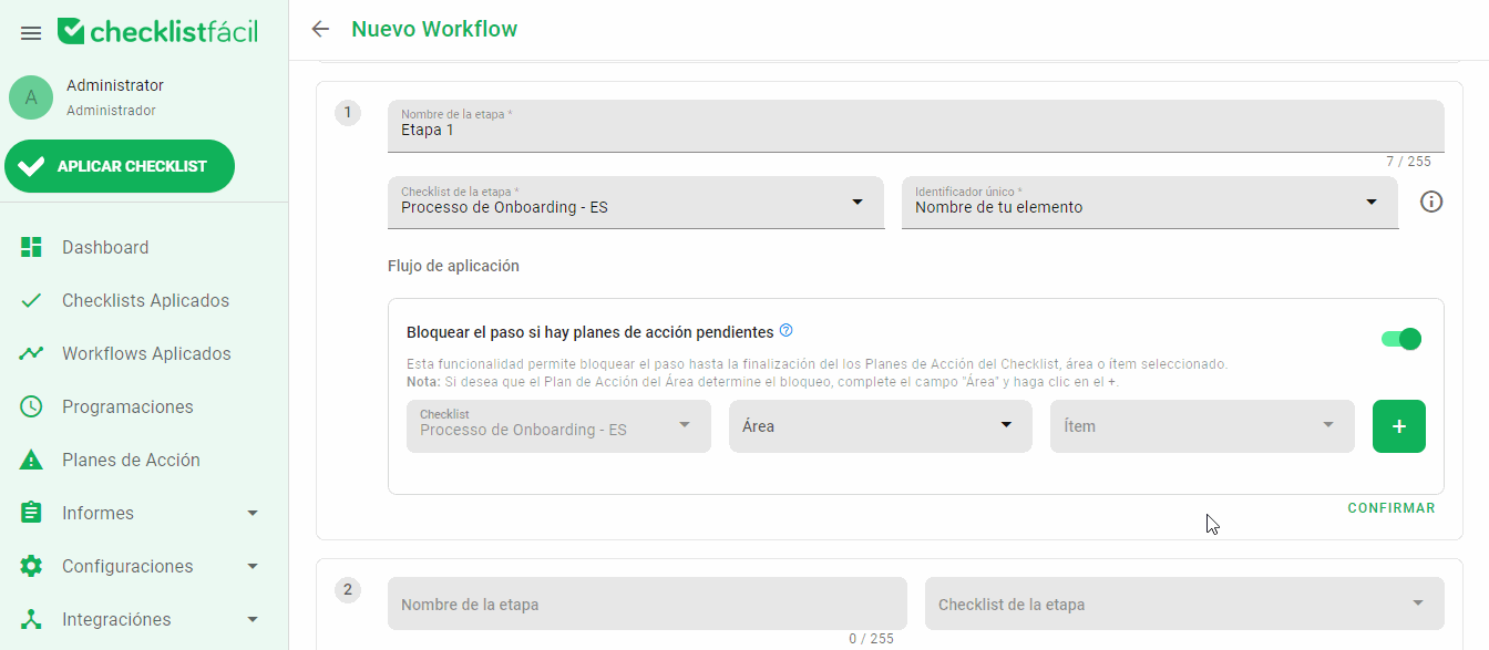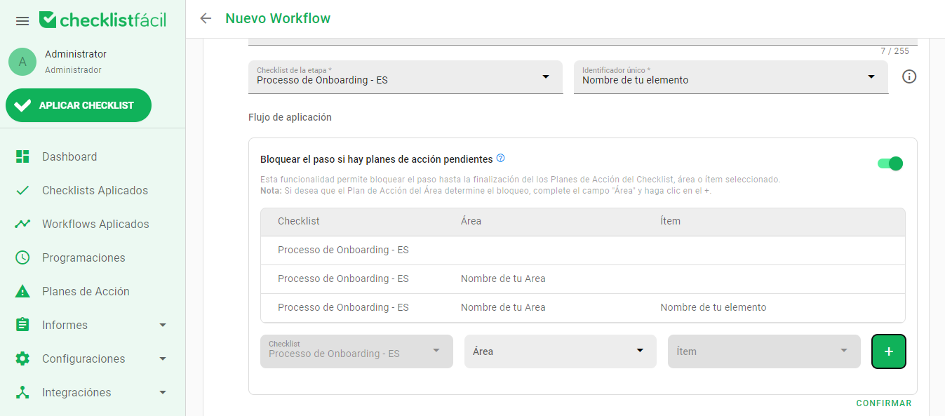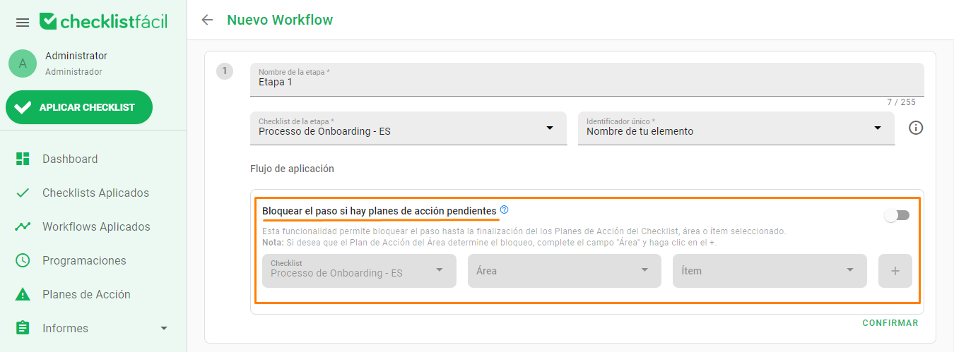 Para proporcionar más control sobre los procesos operativos, la configuración "Bloquear etapa si hay Planes de Acción pendientes" garantiza que un flujo solo avance cuando las desviaciones críticas hayan sido resueltas.
