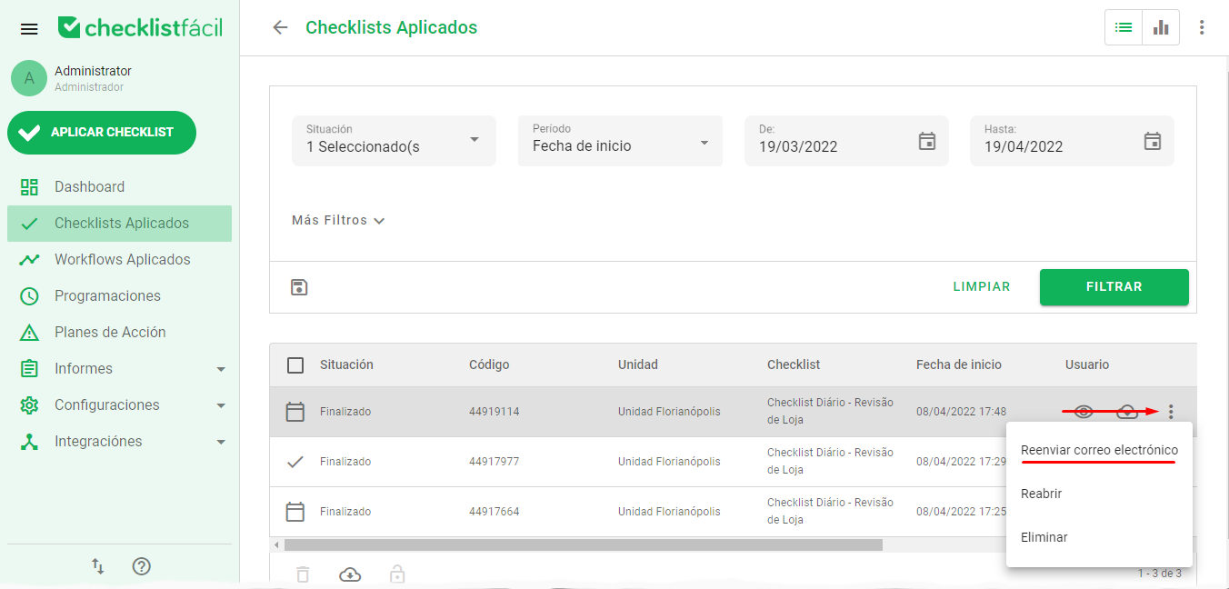 Después de aplicar el filtro, identifique el Checklist deseado e clique en el menú (los tres punto que aparecen al colocarse sobre el Checklist) e escoger Reenviar Correo Electrónico: