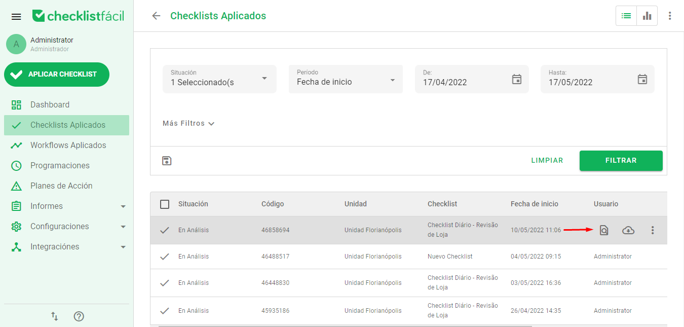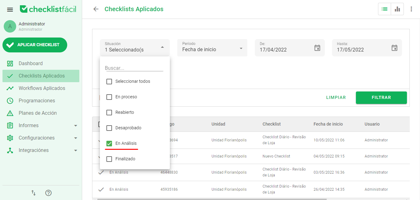 Cuando el flujo de análisis está configurado para una determinado Checklist y su Usuario o Tipo de Usuario participa en ella, podrá encontrar los Checklist pendientes de análisis filtrando por el Status En Análisis: