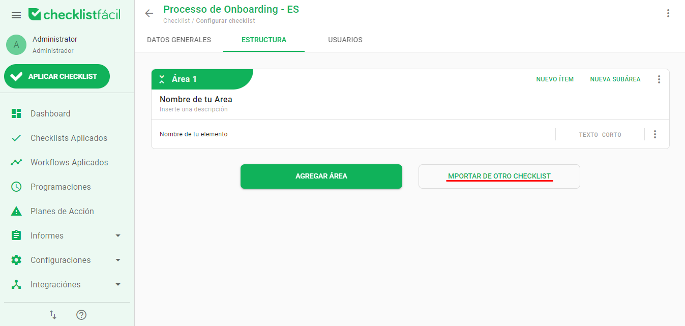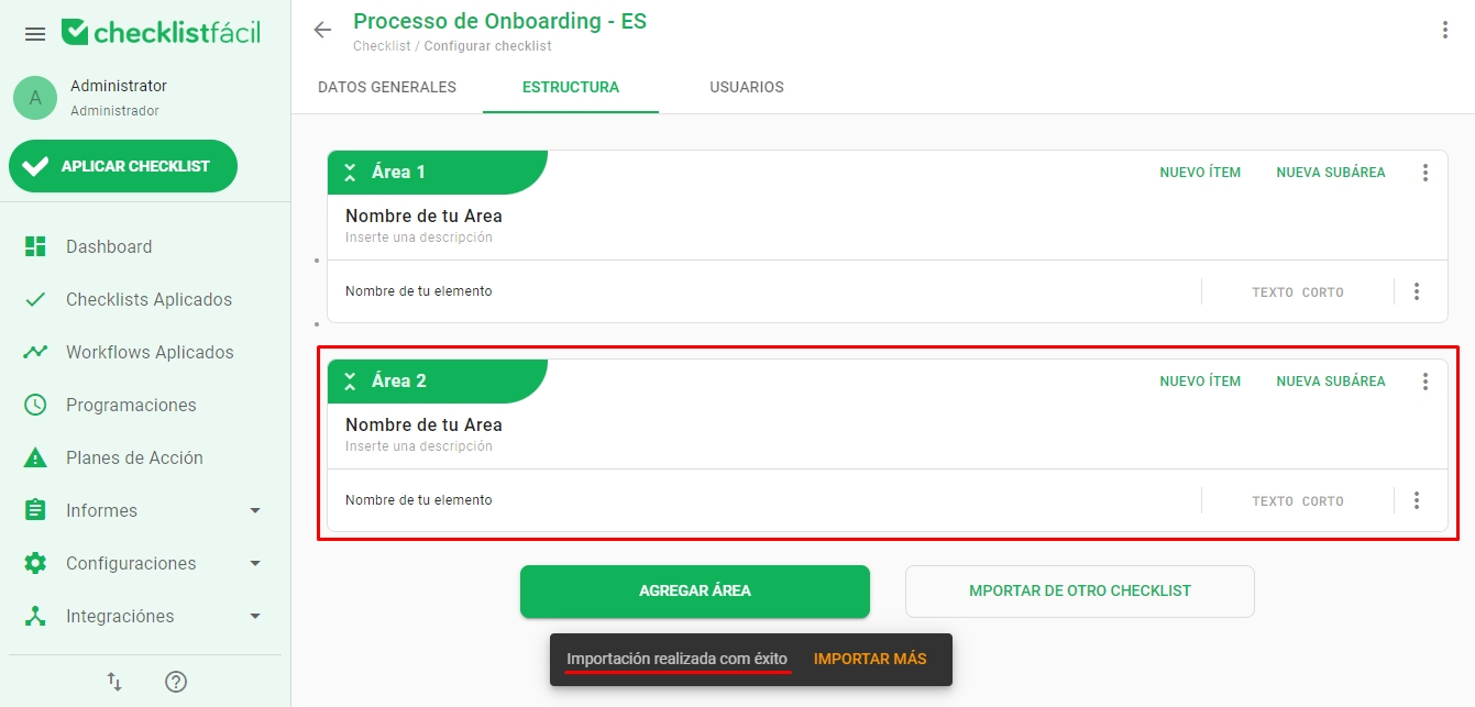 Después de la importación, podrá encontrar las áreas y elementos importados en la estructura de su nuevo Checklist. Podrá moverlos, editarlos o reorganizarlos según sus necesidades.