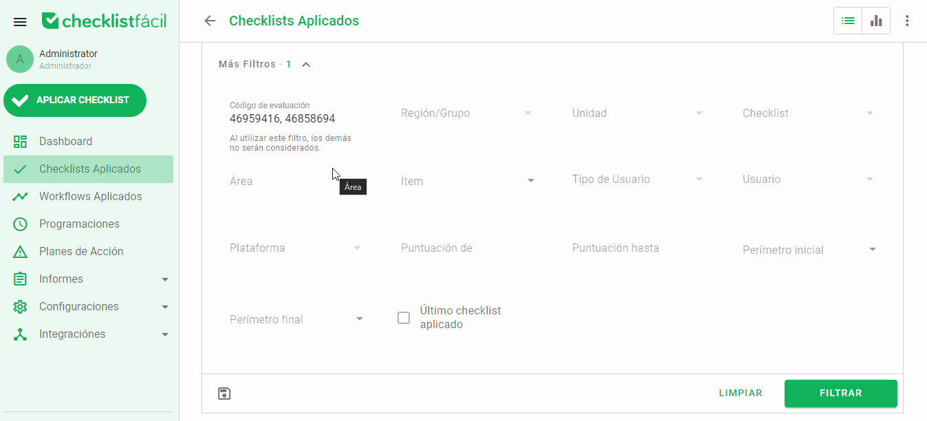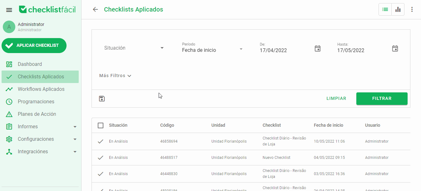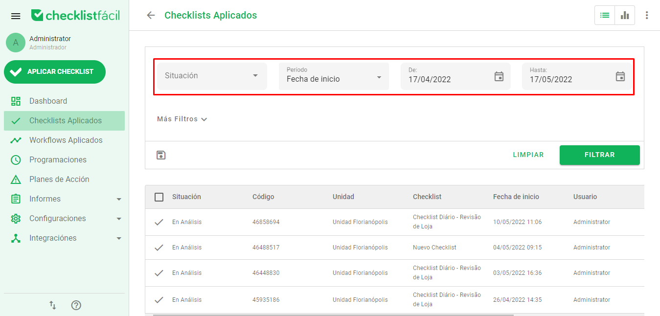 Después de acceder a Checklists Aplicados, puede encontrar las opciones de filtro en la parte superior de la pantalla: