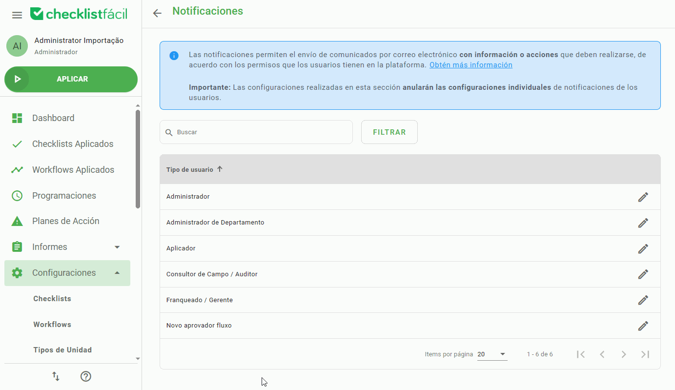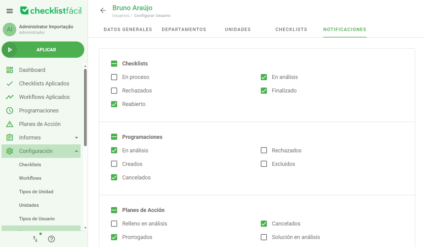 La configuración masiva se realiza en Configuraciones > Notificaciones. Aquí puede determinar de forma estandarizada qué avisos recibirán los usuarios según su Tipo de Usuario.