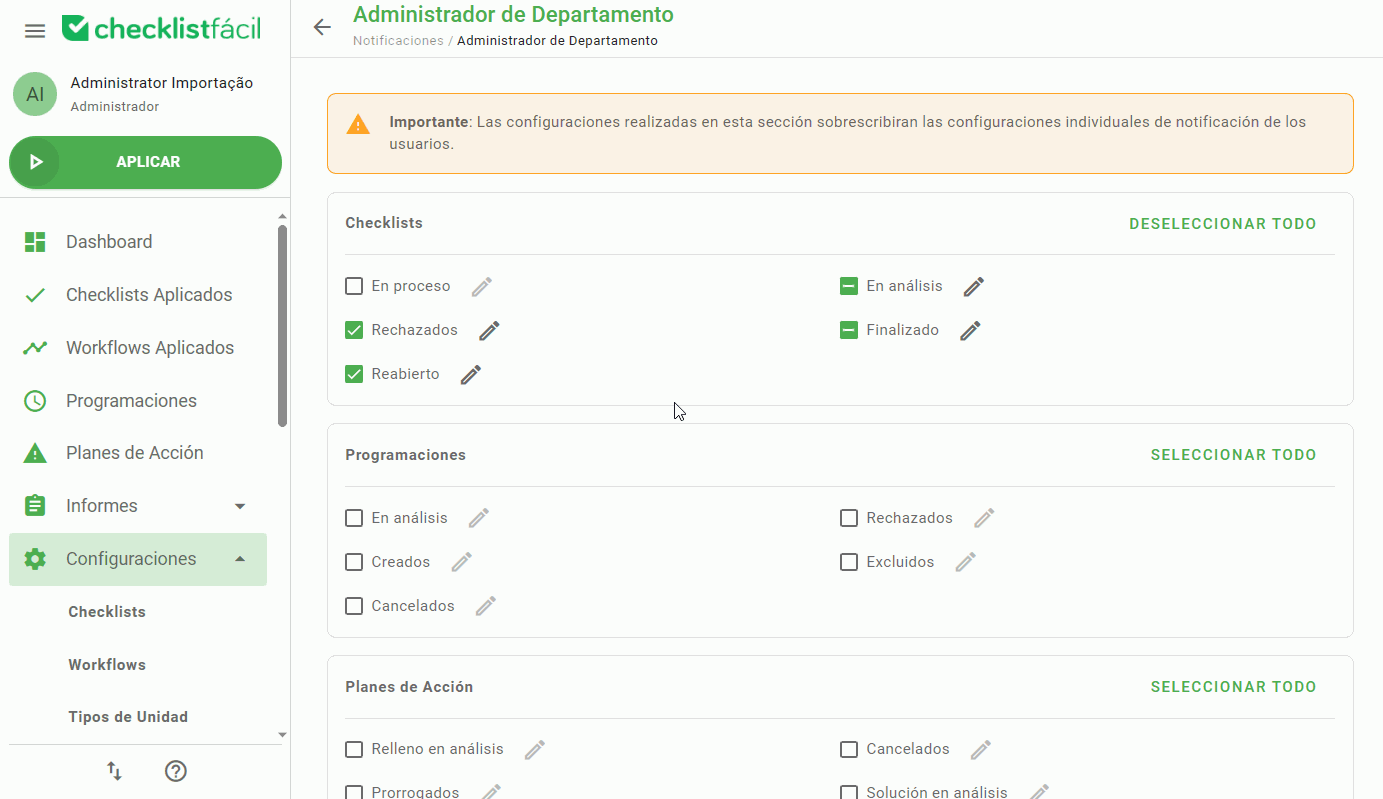 Importante: La configuración masiva realizada en esta sección sobreescribirá cualquier configuración de notificación individual previa.