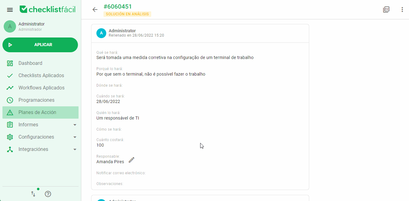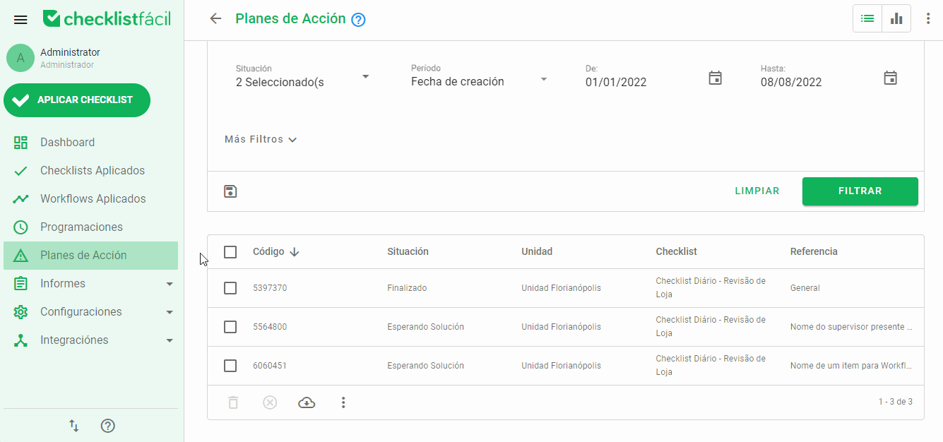 - Lista de planes de acción: Permite realizar cambios masivos en varios planes simultáneamente.