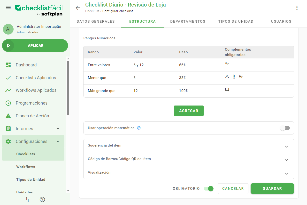 Los rangos te permiten implementar tu regla de negocio en lo que se refiere a los ítems numéricos y hacer que participen en el cálculo de la puntuación del checklist a través del peso, algo que antes no era posible. Esto modifica el comportamiento del ítem y su puntuación según la respuesta ingresada.