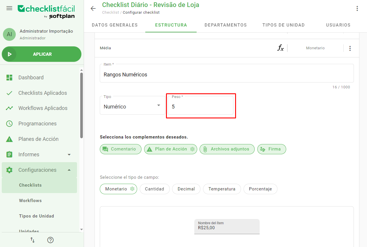 Tras elegir la regla, es necesario completar los campos de Valor (o valores) y definir qué porcentaje del peso contará dicho intervalo. También es posible elegir si los complementos (comentarios o adjuntos) serán obligatorios para ese rango específico: