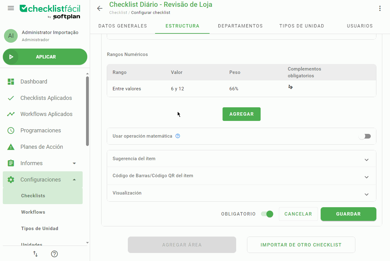 Los rangos le permiten implementar su regla de negocio para los ítems numéricos y hacer que participen en el cálculo de la puntuación de la lista de comprobación mediante el uso de pesos específicos.