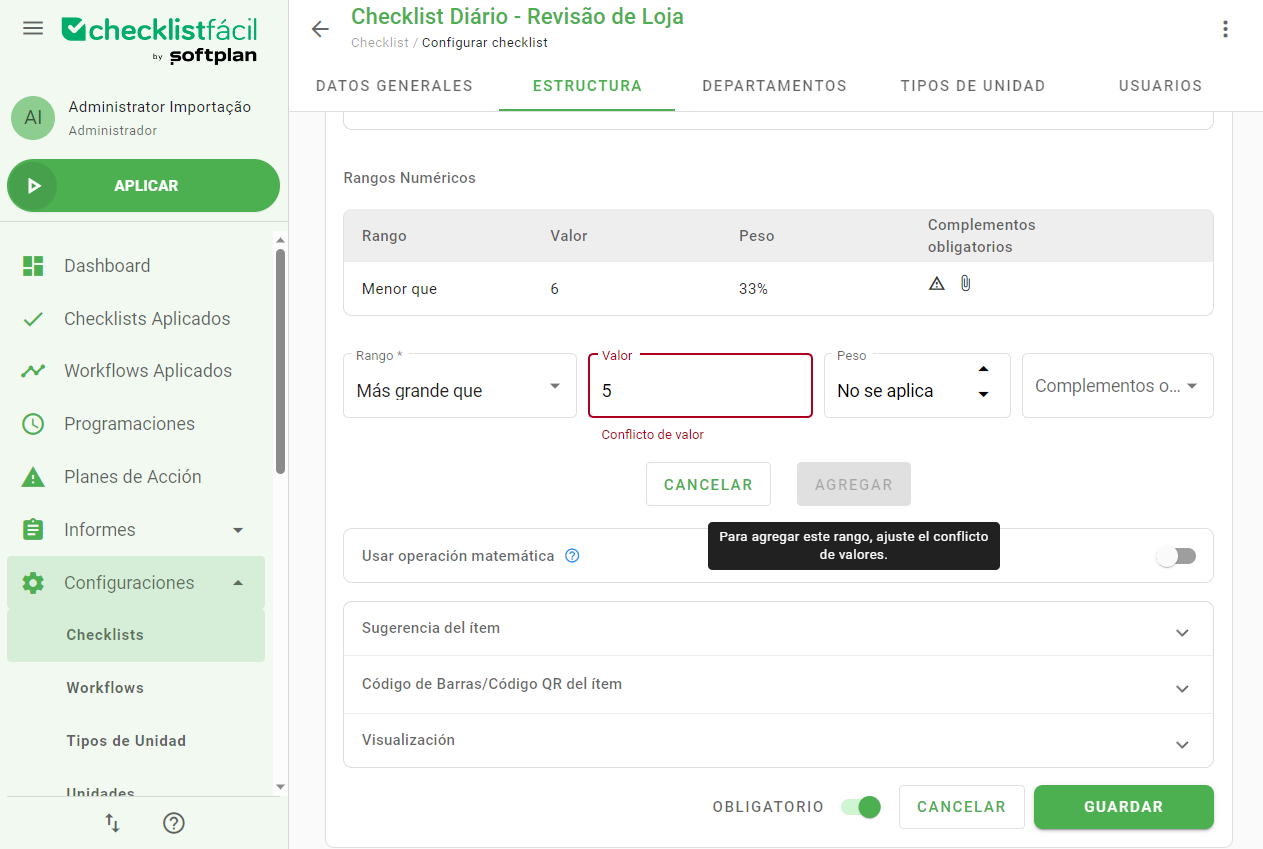 Si el valor ingresado entra en conflicto con algún rango ya existente, el sistema mostrará una advertencia resaltando el campo en rojo: