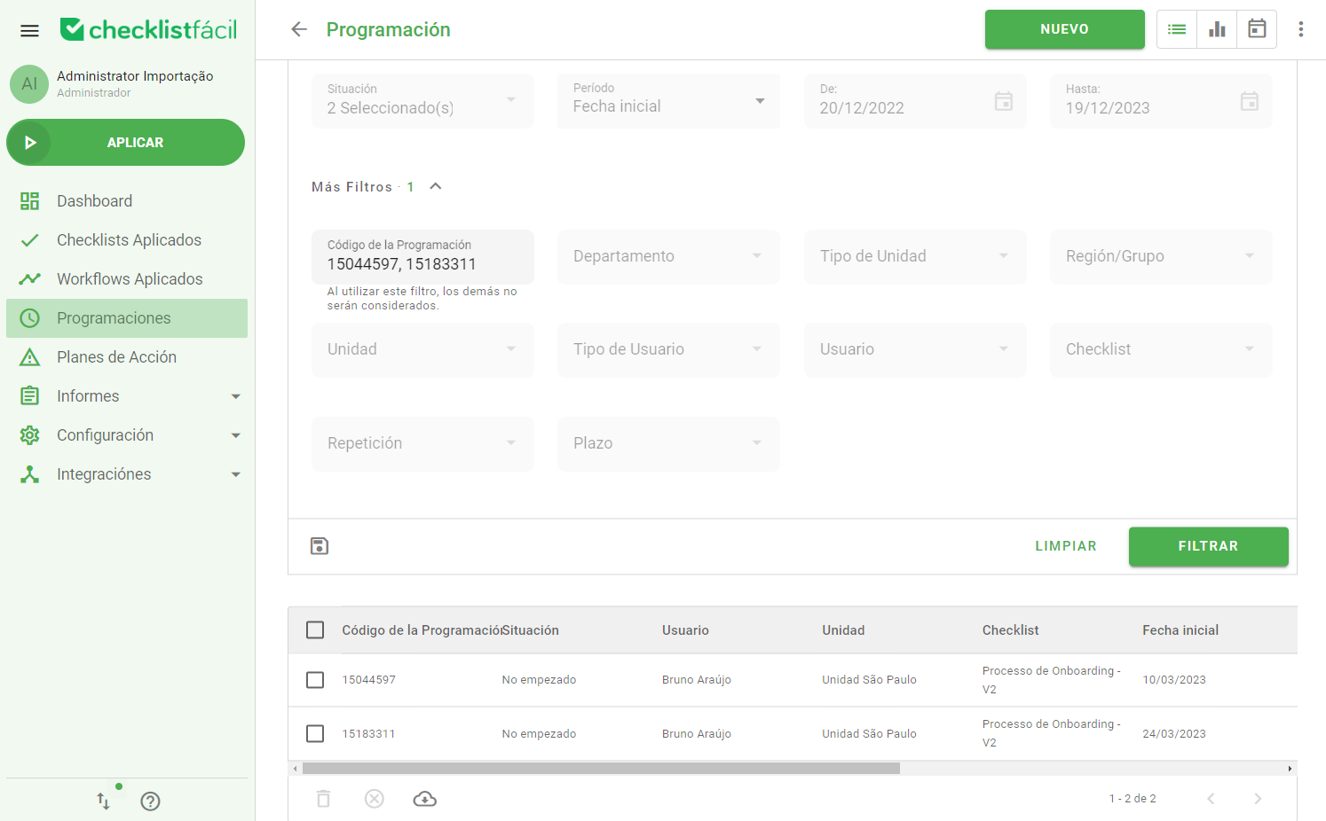 Con el nuevo filtro Código de la programación puede ver los detalles de la programación deseada de una forma más rápida y directa. El campo se comporta de forma similar a los otros campos de código presentes en las pantallas de Checklists Aplicados y Planes de acción.