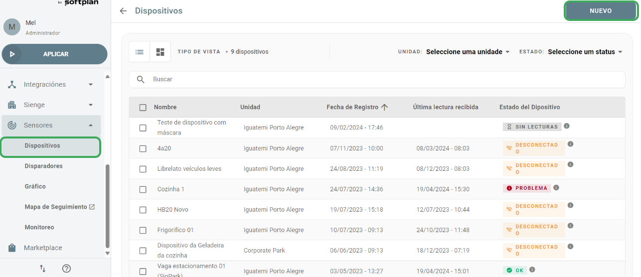 La configuración de un nuevo dispositivo se puede realizar a través de la pantalla Sensores > dispositivos. A continuación, haga clic en Nuevo.