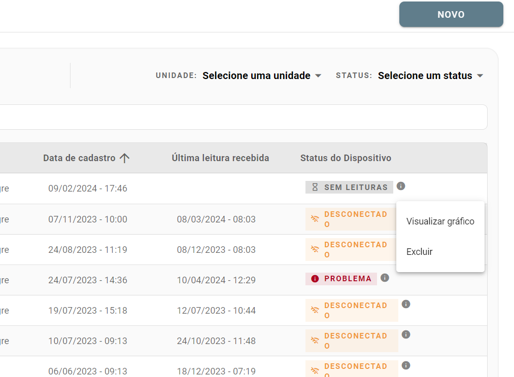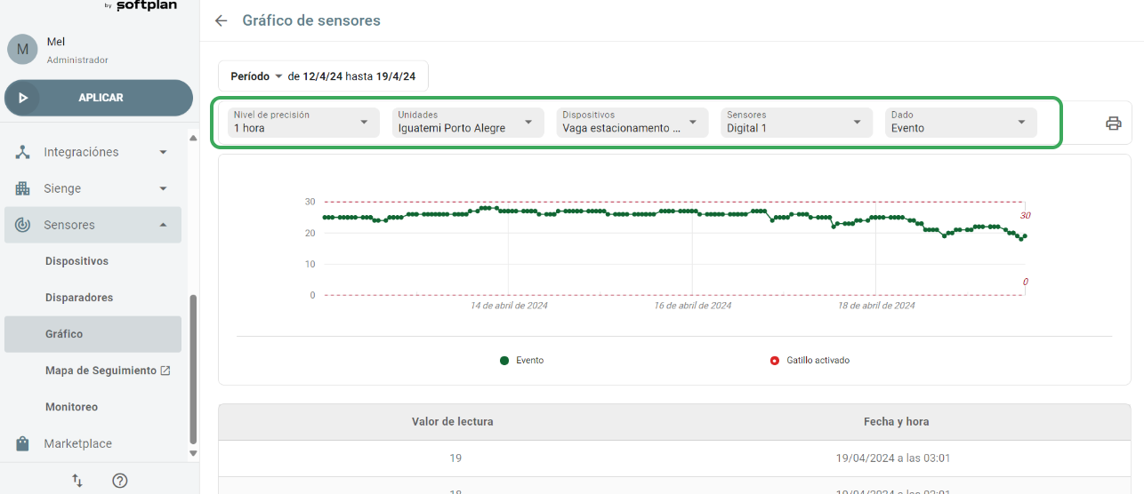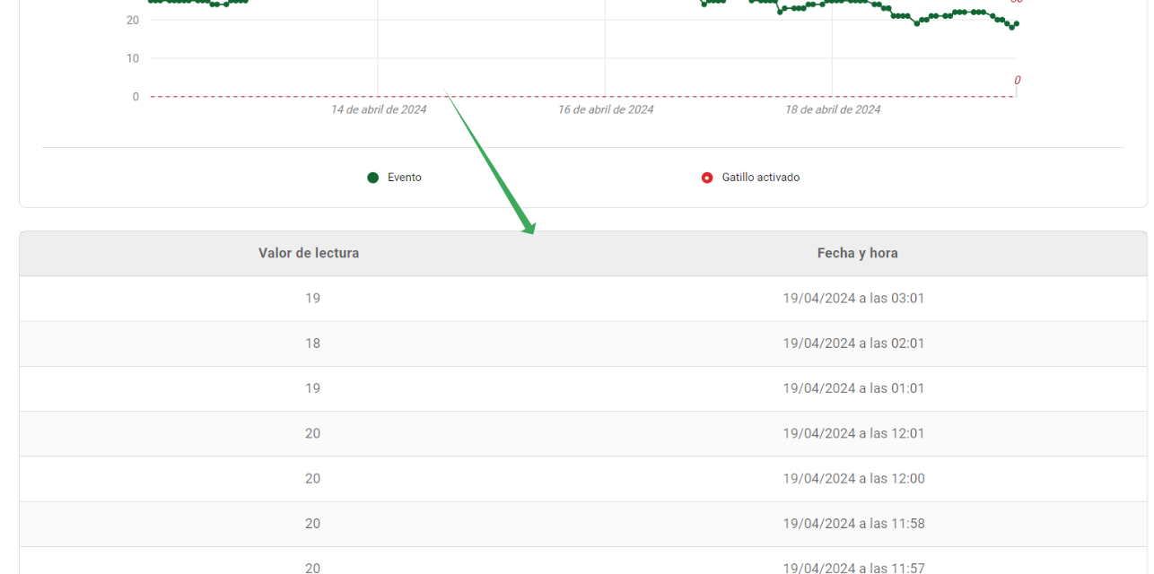 Debajo de los filtros encontrará el gráfico y la lista de entrada de datos, con el valor de la lectura y la hora en que se realizó la lectura.