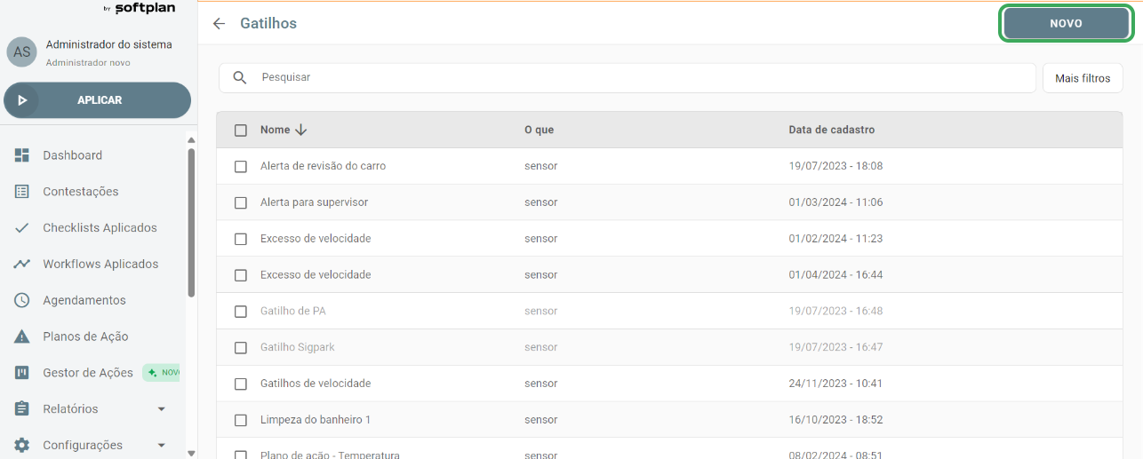 Para configurar un nuevo activador, vaya a Sensores > Disparadores. A continuación, haga clic en Nuevo.