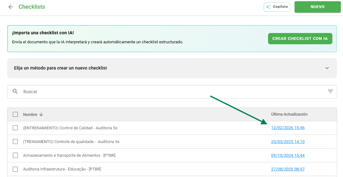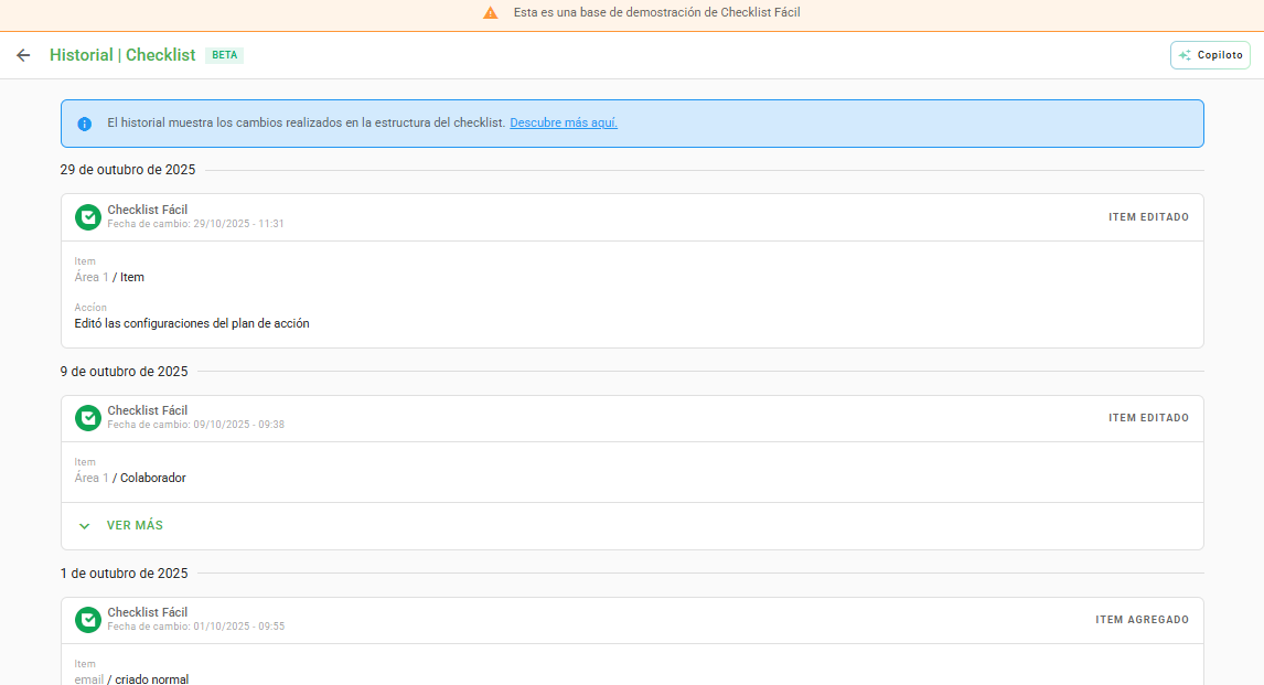 Sugerencia: Utilice el historial para auditar cambios críticos en checklists que afectan directamente la puntuación de sus inspecciones.