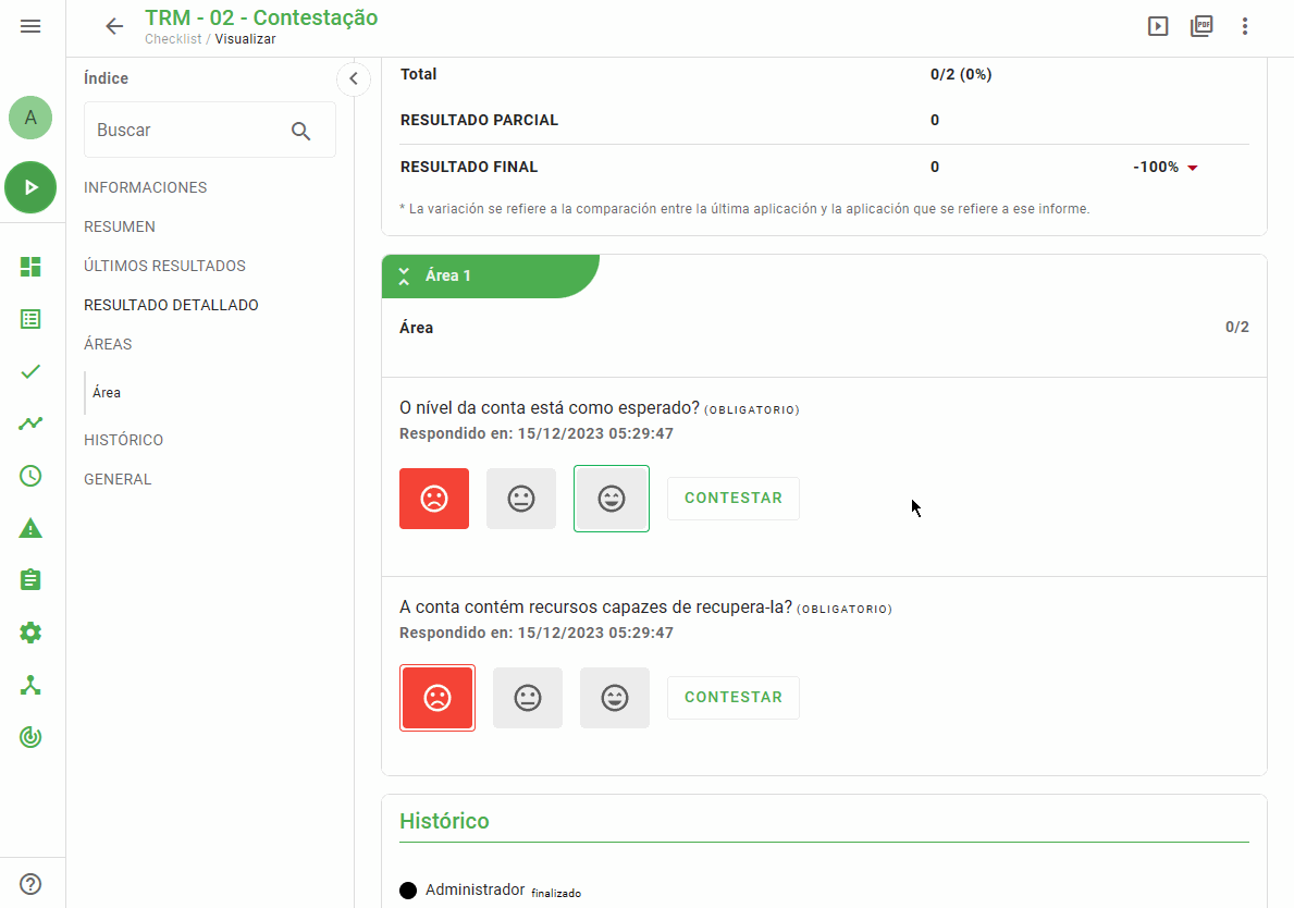 Recuerde que la opción de contestar solo estará disponible si el flujo de aprobación del checklist lo permite y su perfil cuenta con los privilegios necesarios.