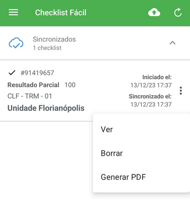 Además de exportar el PDF a través del sistema web Checklist Fácil, a través de un módulo adicional es posible tener esta funcionalidad directamente en la aplicación, inmediatamente después de completar y sincronizar el checklist aplicado.