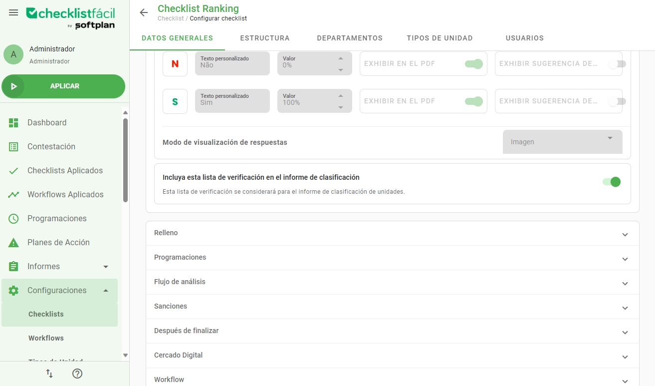 Para que los resultados de un checklist participen en el ranking, primero es necesario configurarlo para que pueda ser contabilizado por el sistema. Encontrarás esta opción siguiendo la ruta: Configuraciones > Checklists > Editar > Datos Generales > Informes.
