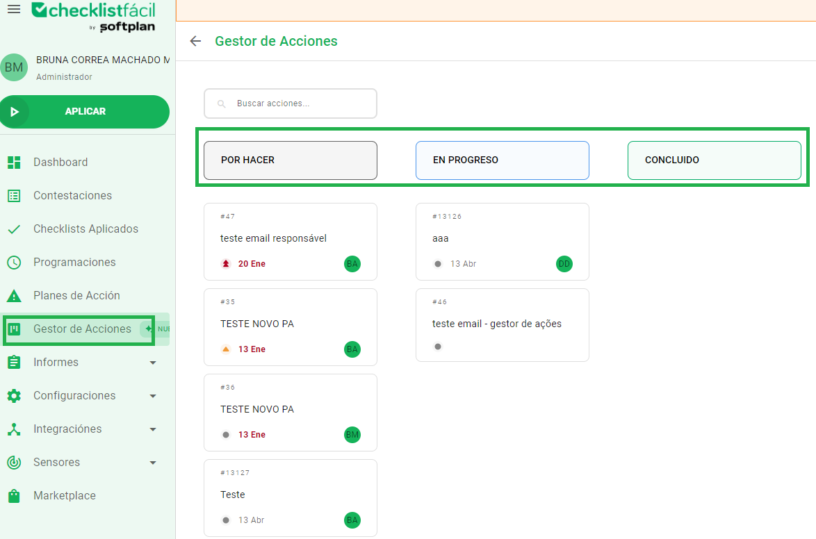 Para ver las acciones creadas, simplemente haga clic en "Gestor de Acciones" en el menú del lado izquierdo. Allí se dividirán las acciones por fases: por hacer, en progreso y concluido.