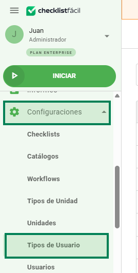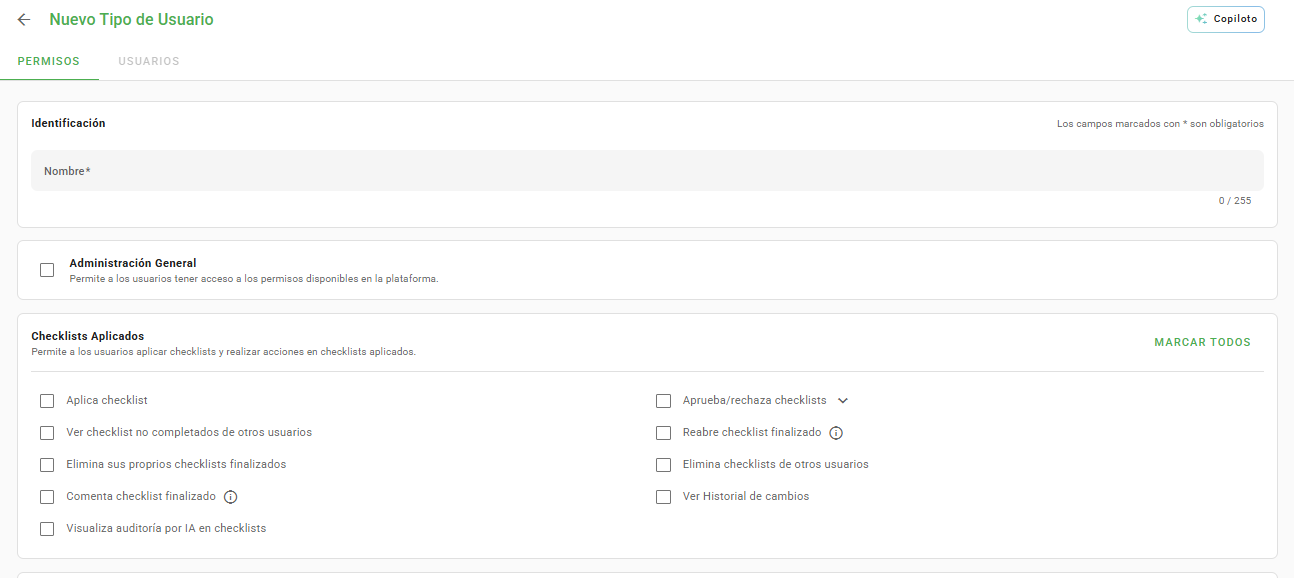 De este modo, es posible crear un tipo de usuario basado en las actividades que uno o más colaboradores desempeñarán dentro de Checklist Fácil.