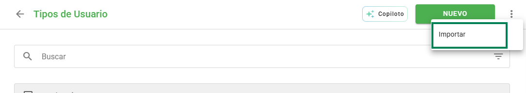 Al acceder a la pantalla de agregar tipos de usuarios, haga clic en los tres puntos y, luego, en Importar: