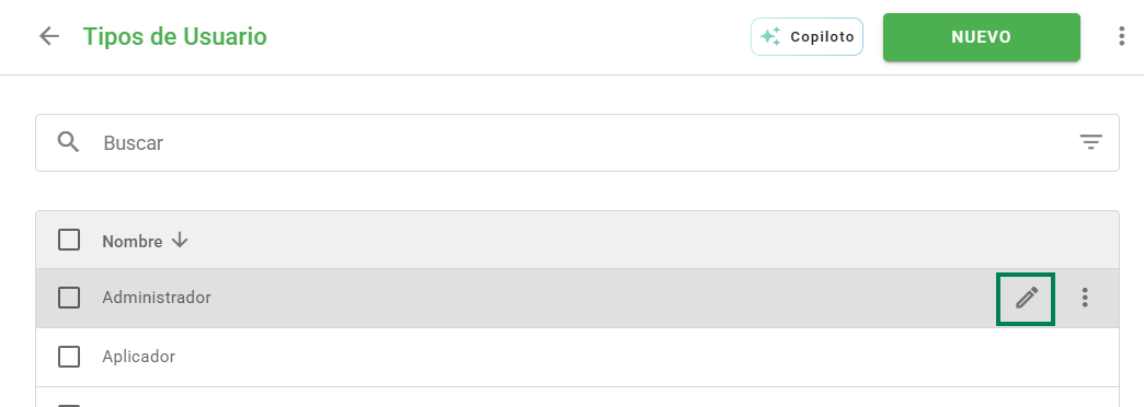 En caso de que usted desee agregar o retirar algún permiso de un tipo de usuario, simplemente diríjase a la pantalla de agregar tipos de usuarios, pase el cursor del mouse sobre el nombre que desea alterar y haga clic en Editar en el ícono destacado en la imagen a continuación: