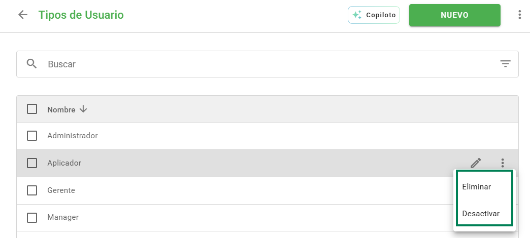 Al lado de la opción de editar, es posible eliminar o desactivar un tipo de usuario, haciendo clic en los tres puntos y seleccionando la opción que desee: