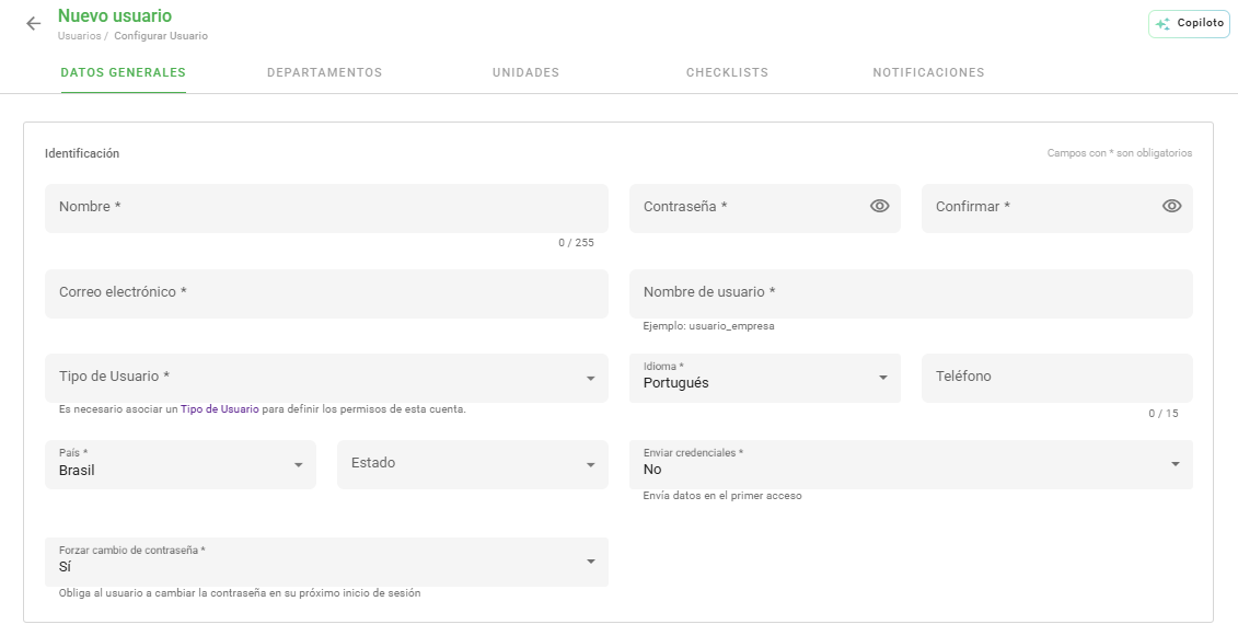 Paso 3: La pantalla de nuevo usuario contiene cuatro pestañas: Datos de registro, Unidades, Checklists y Notificaciones.