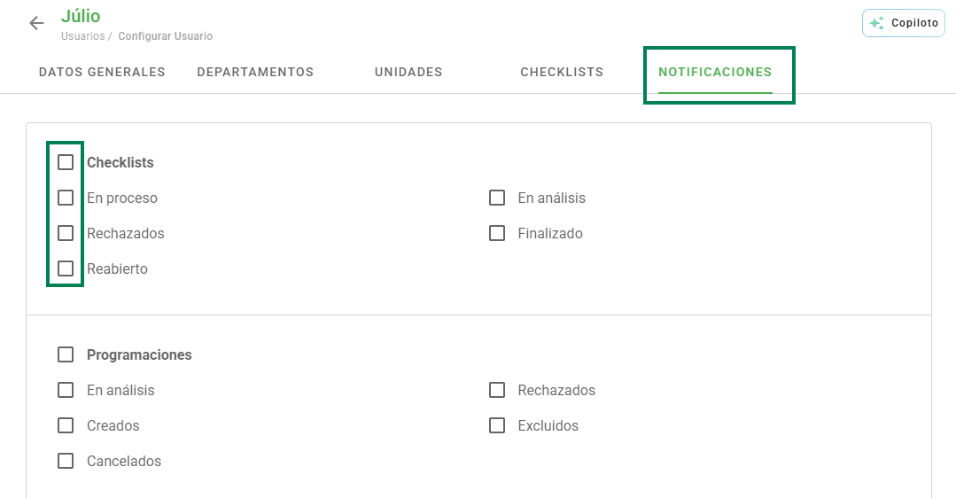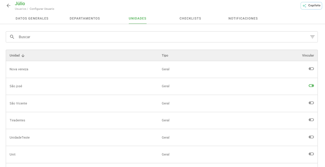 De la misma forma, es posible activar o desactivar el vínculo de este usuario con unidades y checklists en las pestañas correspondientes, además de alterar las notificaciones.