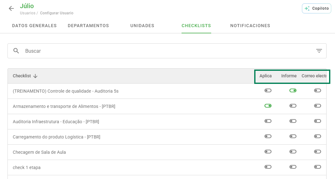 El proceso es muy parecido a los descritos anteriormente: haga clic en la pestaña Checklist y defina si el usuario podrá aplicar, visualizar informes y/o recibir e-mails relacionados a cada checklist en el que esté involucrado. Después, solo debe guardar.
