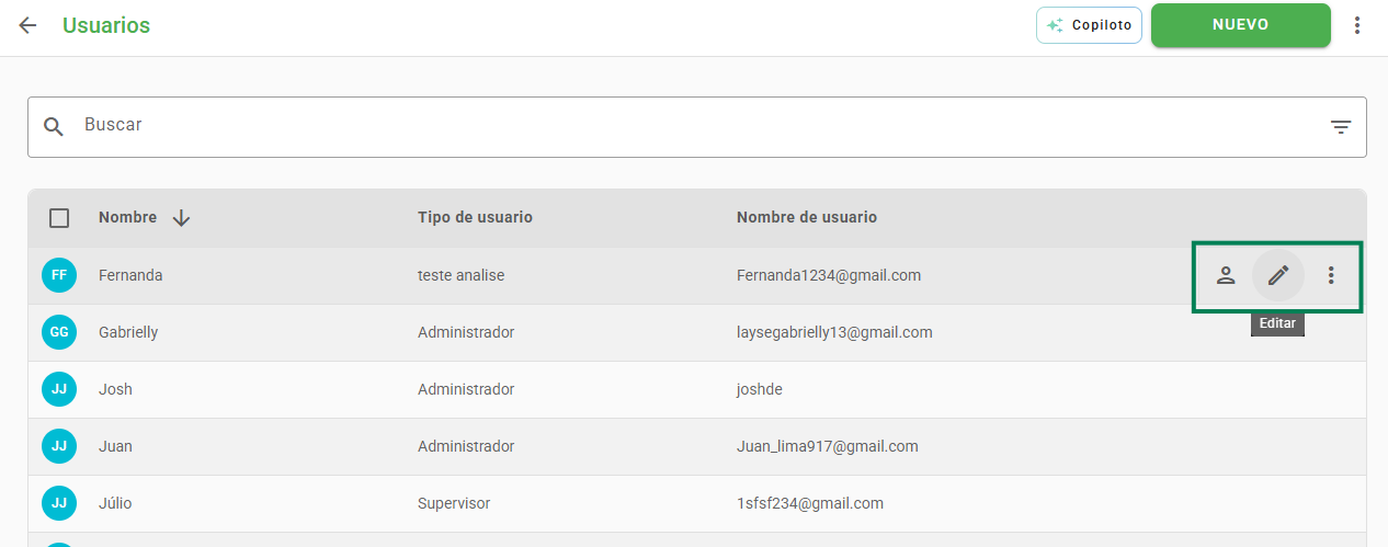 En caso de que usted necesite agregar o cambiar alguna información referente a un usuario, solo debe ir a la pantalla de agregar usuarios, pasar el cursor del mouse encima del nombre que desea alterar y hacer clic en Editar en el ícono destacado en la siguiente imagen: