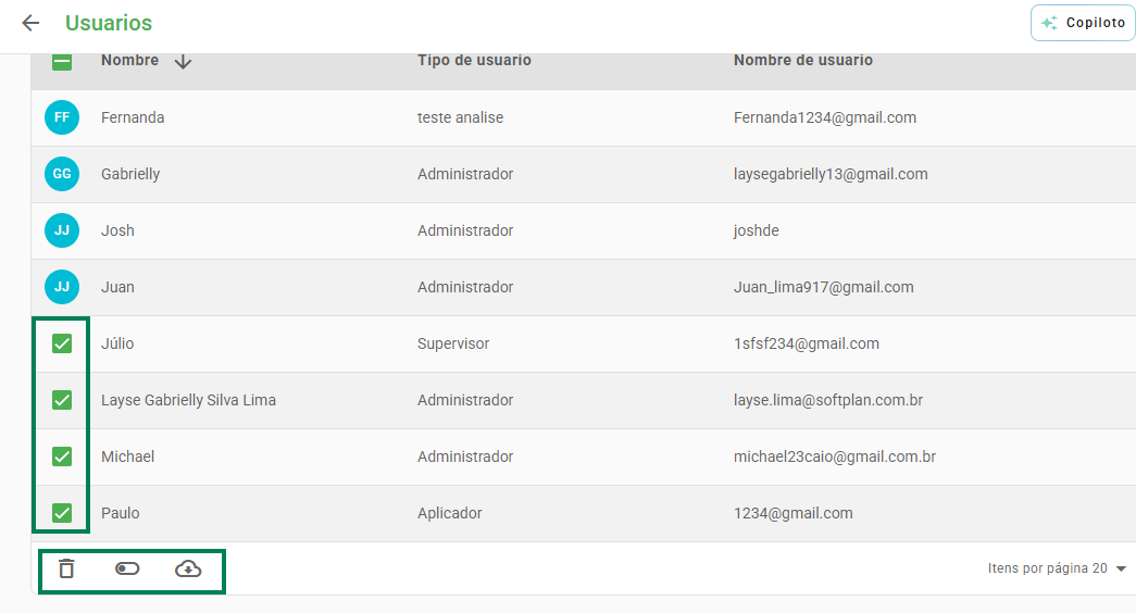 En caso de que usted quiera eliminar, desactivar o exportar varios usuarios de una sola vez, seleccione las casillas correspondientes a ellos y aplique las acciones en masa que están disponibles en el pie de la página: