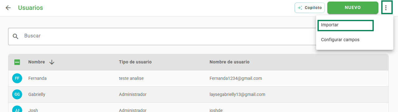 Al acceder a la pantalla de agregar usuarios, haga clic en los tres puntitos y, después, en Importar: