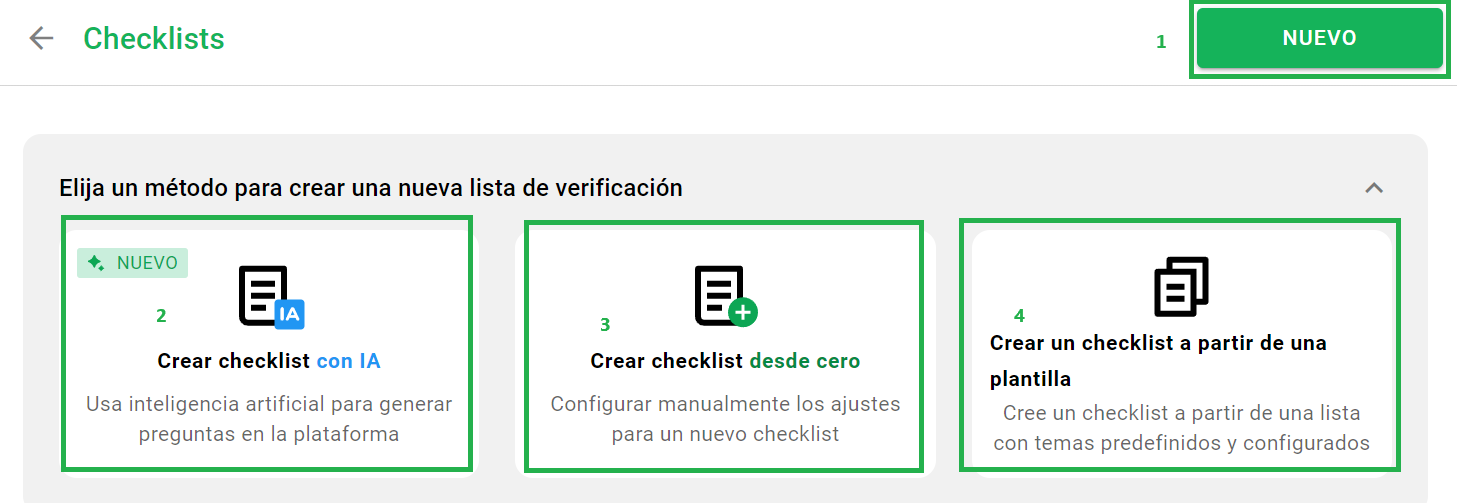 Paso 2: existen 4 maneras de usted crear un checklist, siendo las opciones: (1) Nuevo, (2) Crear checklist con IA, (3) Crear un checklist desde cero o (4) Crear un checklist a partir de una plantilla.