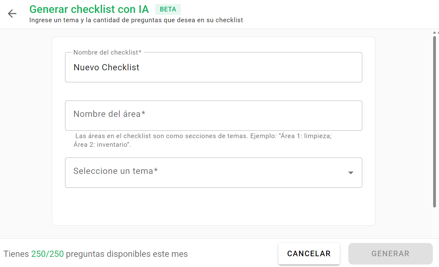- (2) Crear checklist con IA: Esta opción te permite utilizar inteligencia artificial (IA) para generar preguntas para tu checklist, optimizando el tiempo. Solo dale un nombre, ingresa el nombre del área, selecciona un tema de interés, la cantidad de preguntas que deseas y listo: ¡tu checklist se generará automáticamente!