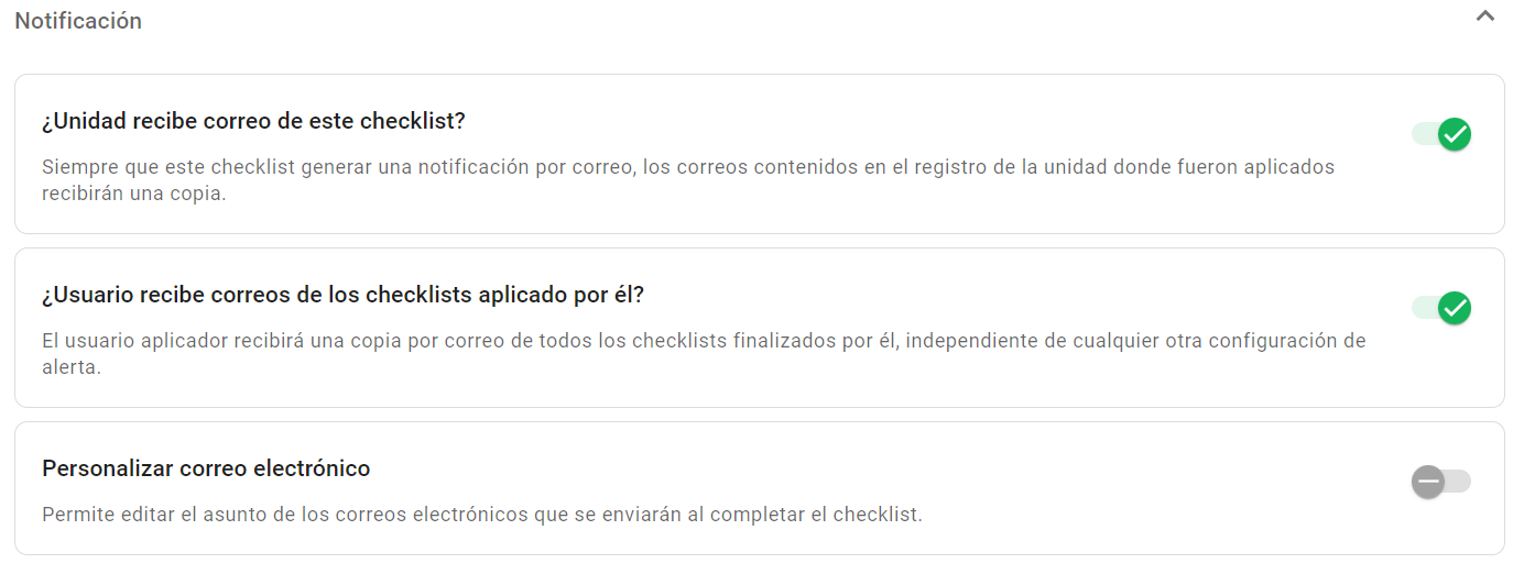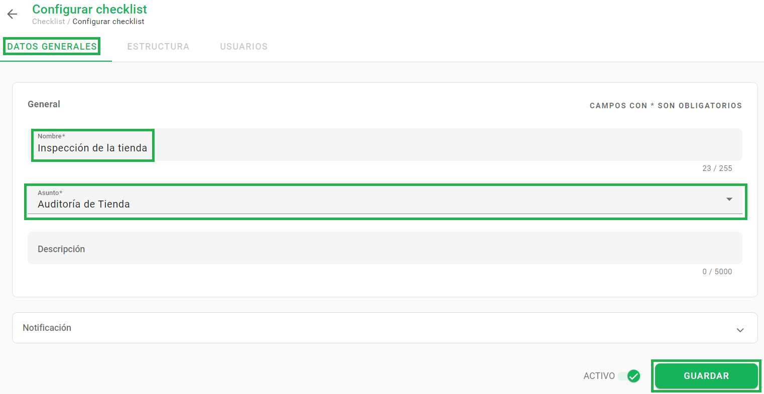 ➕ Consejo: Aún en la pestaña Datos Generales, es posible configurar las notificaciones, habilitando las casillas de verificación y permitiendo que sus unidades y usuarios vinculados al checklist sean notificados, por correo electrónico, cuando la aplicación genere una notificación. También puede personalizar el asunto de los correos electrónicos que se enviarán al completar el checklist.![]()