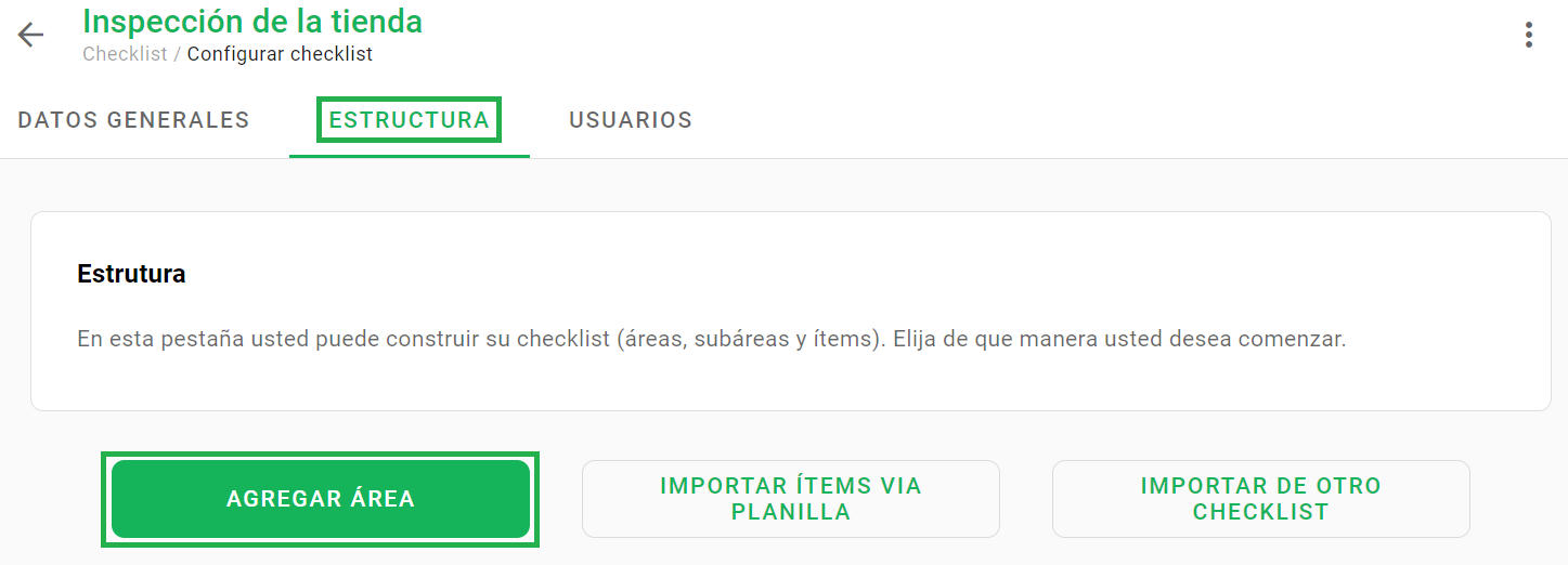 La próxima pestaña es la de Estructura, en la que agregarás preguntas y complementos a tu checklist. En general, esta es la parte que será evaluada por el usuario aplicador.
