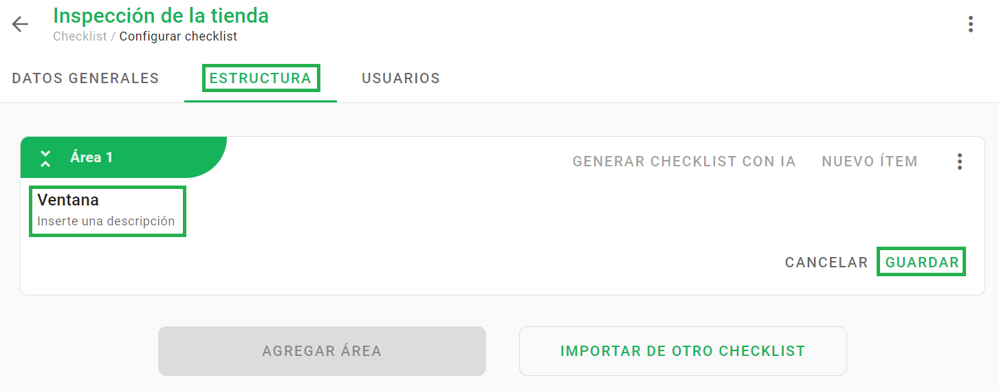 ** Puedes agregar tantas áreas como quieras dentro de un checklist.
