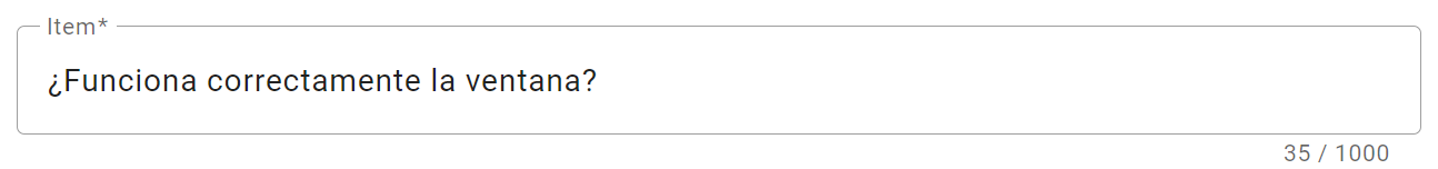 - Item: este es el campo donde agregarás exactamente lo que el aplicador debe evaluar. Ejemplos: "¿Está limpio el suelo?" o "¿Funciona correctamente la ventana?".