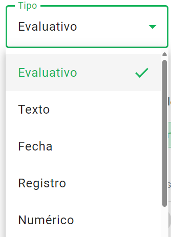 - Tipo: este campo indica cómo se evaluará el ítem, pudiendo elegir una de las 7 opciones existentes.