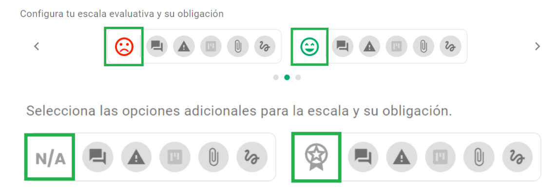 Tipo Evaluativo: es el tipo más común, con tres opciones de respuesta disponibles: Sí o No, caras evaluativas o escala de respuesta adicional, ofreciendo las posibilidades de N/A (no aplica) y Medalla (superada).