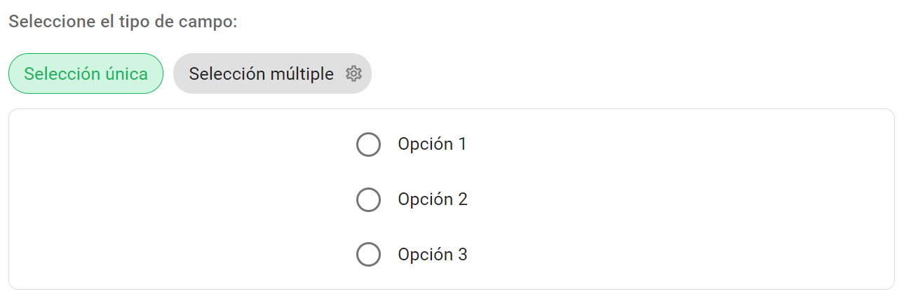 Tipo lista de selección: El tipo de lista de selección le permite crear una lista de opciones que se pueden seleccionar en el momento de la evaluación. Es posible definir si el aplicador puede seleccionar solo una (selección única) o varias opciones (selección múltiple).