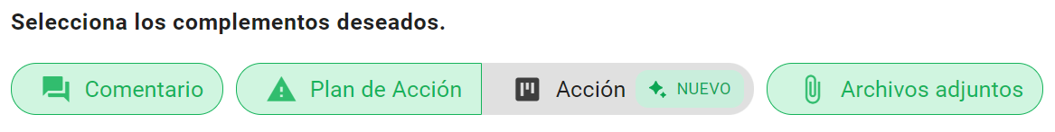 Por tanto, si selecciona estos complementos, el aplicador deberá -obligatoriamente- cumplimentarlos en el momento de la solicitud. Ellos son: Comentario, Plan de acción, Acción y Archivos adjuntos.