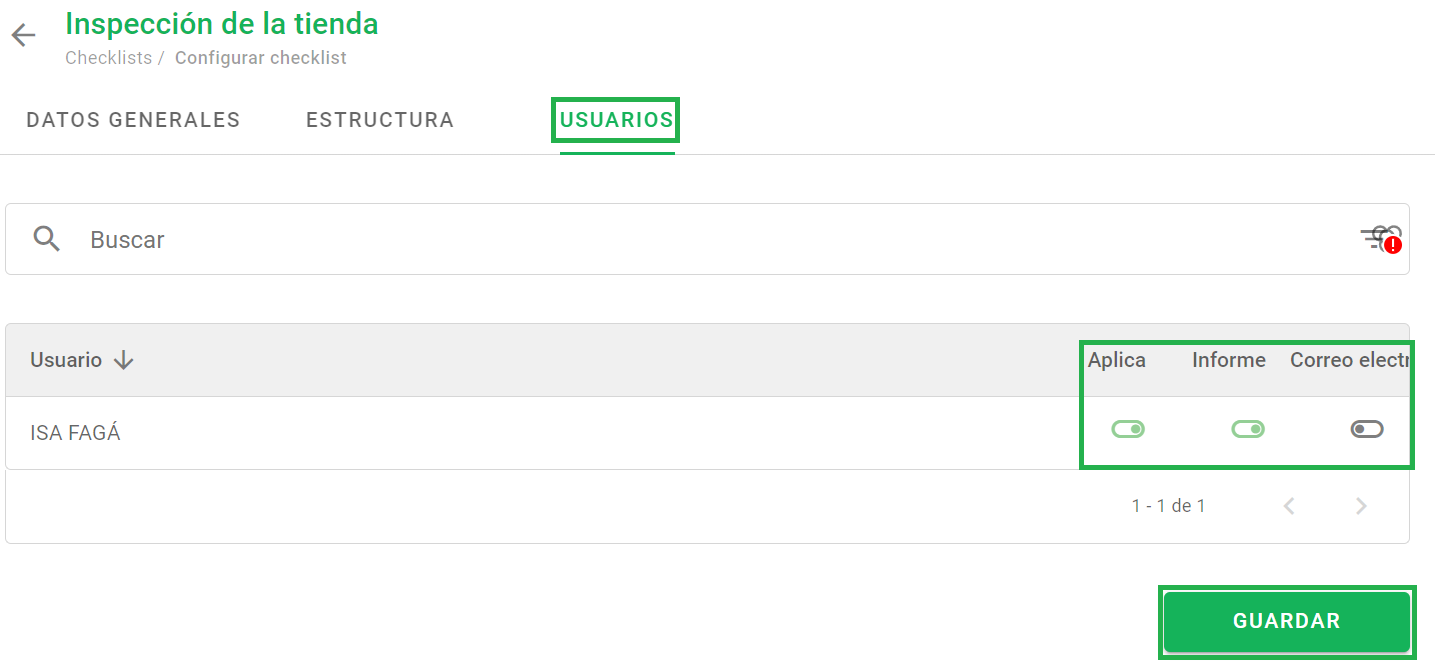 La última pestaña es Usuarios, en la que vincularás este checklist según el rol que desempeñará cada usuario en las evaluaciones. Al igual que con el resto de pestañas, simplemente habilita el enlace en las casillas correspondientes y guarda.